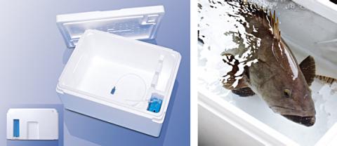 活けす函は「泳ぐ魚をそのまま発送」をテーマに開発された、水産用エアーポンプの取り付けホルダーが付いた製品です。